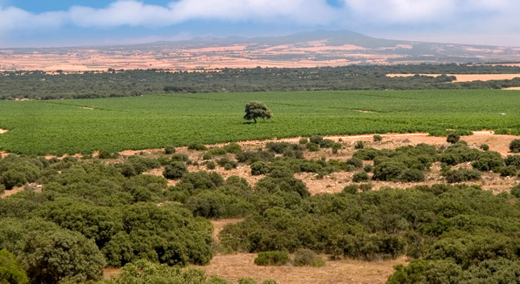 La extraordinaria extensión integra las 421 hectáreas de viñedo en un entorno de otras 600 hectáreas de monte bajo mediterráneo, donde dominan las encinas y las coscojas, con arbustos como romero y tomillo y una fauna muy diversa, desde lagarto ocelado, el lirón careto y otras especies como el conejo, la liebre o la perdiz.