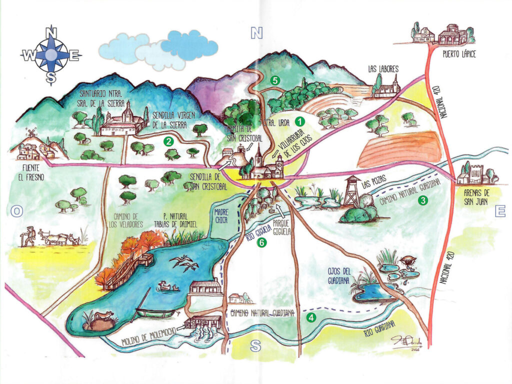 Distancia: 19,6 kilómetros, desde el puente romano de Villarta de San Juan . Cuenta con un observatorio de “Las Charcas”, uno a ras de la laguna y otra en altura desde donde se contempla todo el paisaje. Y distancia: 28,8 kilómetros para llegar al Parque Nacional de las Tablas.